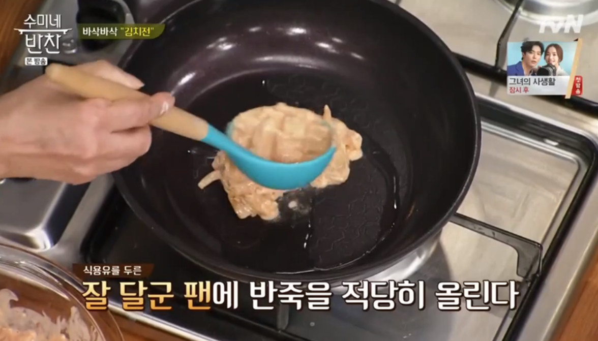 6. 잘 달군 팬에 식용유를 적당히 두른 뒤, 반죽을 올려주세요.