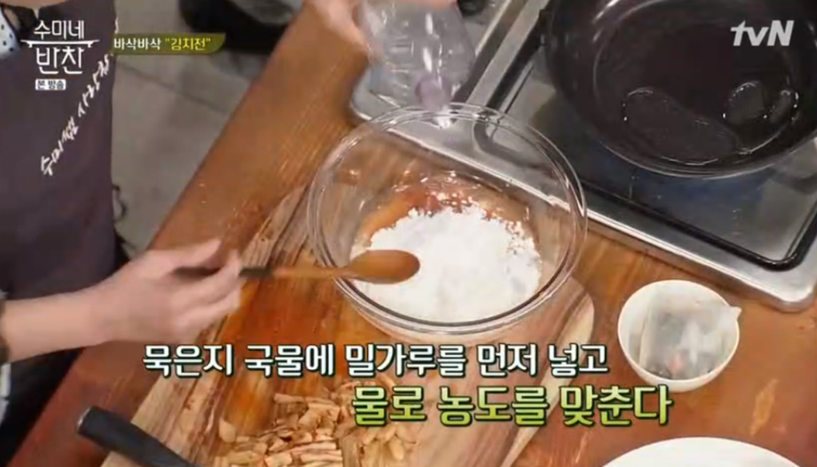 3. 김치전을 더욱 바삭하게 만들기 위해 부침가루도 약간 넣어주세요.