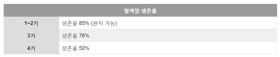 이상으로 혈액암의 증상과 생존율에 대해 살펴보았습니다. 혈액암은 충분히 완치가 가능한 질환이며, 특히 최근에는 혈액암 세포를 표적으로 하는 치료제가 개발되면서 완치 가능성이 더욱 높아지고 있습니다. 설령 완치에 이르지 못하더라도 기존 항암제보다 부작용이 적은 치료법 덕분에 장기간 생존하는 경우도 많습니다. 따라서 혈액암 치료는 정확한 진단을 받고, 환자 개인의 상태에 가장 적합한 치료 방법을 찾아 적극적으로 치료를 이어가는 것이 무엇보다 중요합니다. 읽어주셔서 감사합니다.