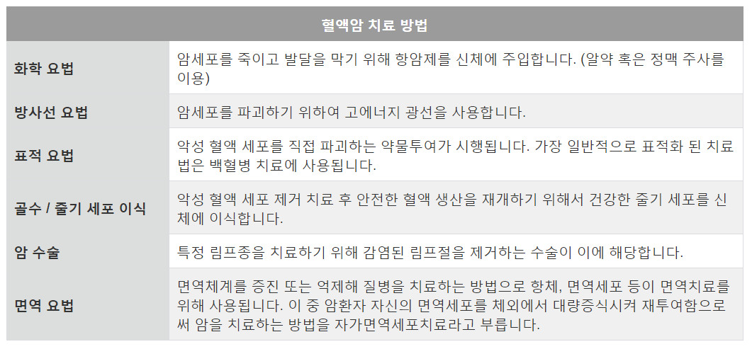 혈액암은 혈액을 구성하는 세포 성분인 백혈구, 적혈구, 혈소판이 형성되는 과정에서 이상이 생기면서 암세포가 발생하는 질환입니다. 일반적인 암과 달리 혈액암은 특정 장기에 종양 덩어리를 형성하지 않고, 혈액을 비롯해 골수와 림프절 등으로 퍼져나가기 때문에 종양 부위를 명확히 지정할 수 없어 수술적 치료가 불가능합니다. 따라서 일반적인 암처럼 수술로 제거하기보다는 혈액에 직접 항암제를 투여하거나 방사선 치료 등을 시행하는 것이 기본 치료 방법이며, 다행히 다른 암들에 비해 치료 효과는 비교적 좋은 편입니다.