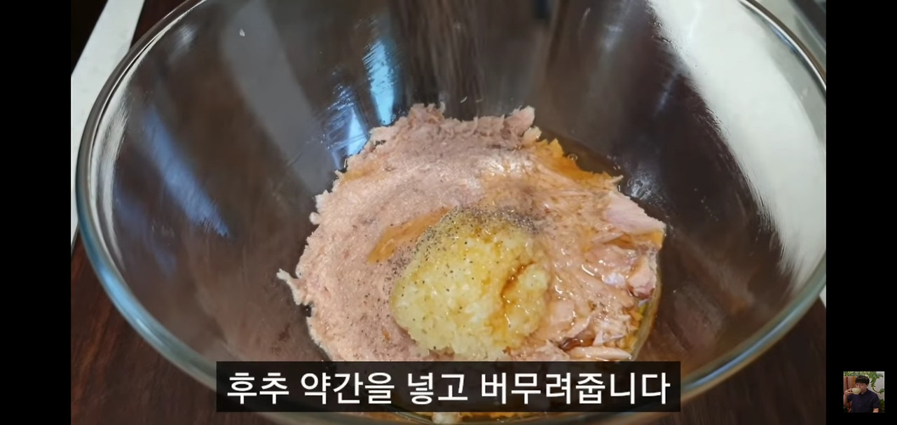 참치캔(200g)은 기름을 제거한 뒤 두부와 함께 담고, 다진 마늘 반 스푼을 넣어 주세요.