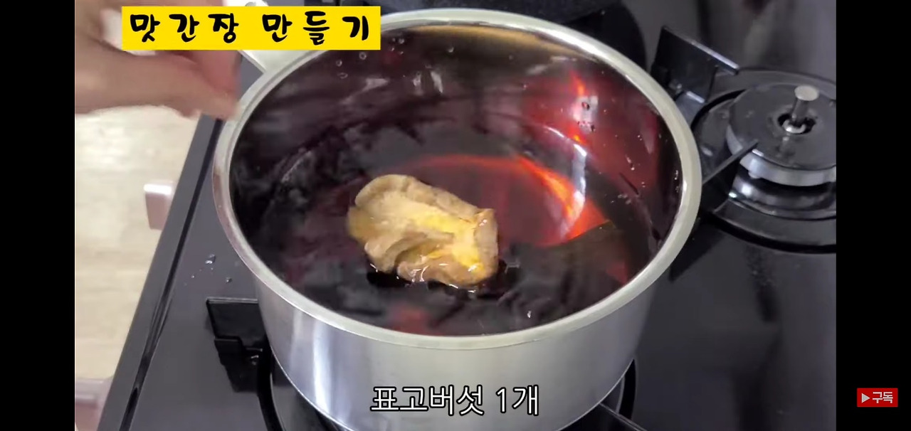 향이 좋은 표고버섯 한 개와 대파 반 개를 함께 넣어 주시고, 여기에 파뿌리까지 더하면 풍미가 한층 더 살아납니다.