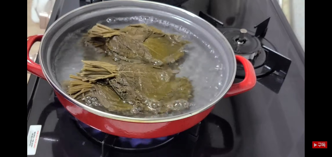 깻잎김치를 담글 때 필요한 깻잎 손질부터 해보겠습니다. 먼저, 소금물에 약 일주일 정도 절여 둔 깻잎을 준비한 뒤, 끓는 물에 10분 정도 데쳐줍니다. 이렇게 하면 깻잎이 한층 더 부드러워지고, 밥과 함께 먹기에 알맞은 식감으로 변합니다!
