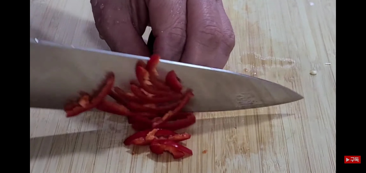 홍고추 2개는 반으로 갈라 얇게 썰어 주면, 깻잎김치에 들어갈 재료 손질이 모두 완료됩니다.