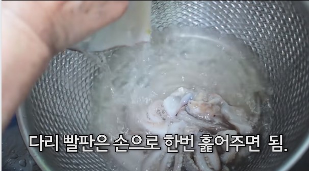 손질한 오징어는 흐르는 물에 깨끗이 씻어 주세요. 오징어 다리의 빨판은 손으로 가볍게 닦아주시면 됩니다.