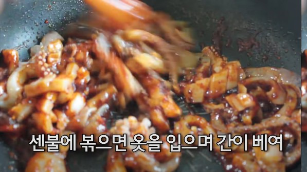 센 불에서 볶으면 오징어가 양념에 잘 스며들어 간이 배게 됩니다. 양념이 바글바글 끓을 때 생오징어를 넣으면, 오징어가 양념을 흡수하면서 수분이 덜 생깁니다.