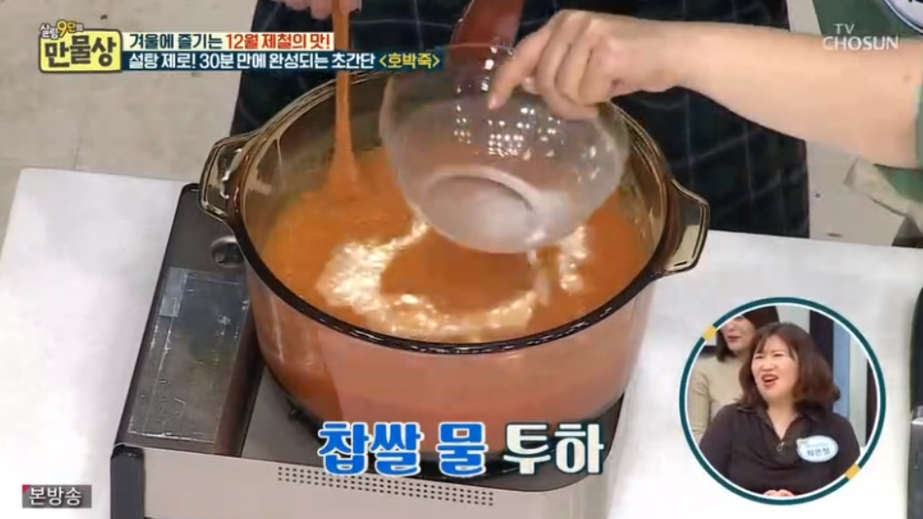 오늘 알려드리는 레시피에는 설탕이 들어가지 않는데요, 설탕 없이도 호박죽의 단맛을 최대한 살리는 이보은 요리연구가의 특급 비법은 바로 단감이라고 합니다.