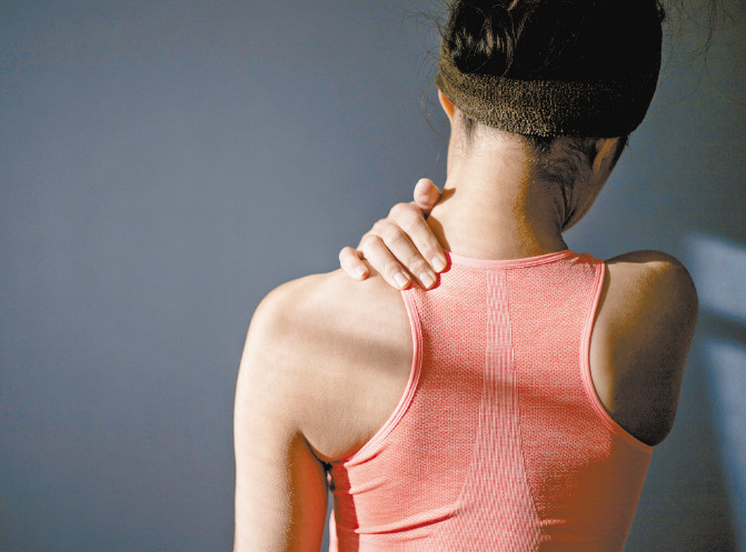 가슴을 펴고 목을 뒤로 당긴 자세로 앉거나 걷는 습관을 들이면 어깨와 목의 부담을 줄일 수 있습니다.