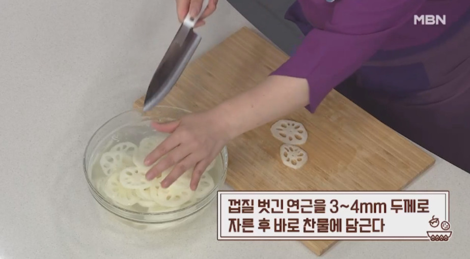 1. 먼저 연근을 깨끗이 씻은 뒤 껍질을 벗겨 주세요. 껍질을 제거한 후에는 갈변을 막기 위해 바로 찬물에 담가 주시고, 3~4mm 두께로 썰어 다시 물에 담가 주세요.