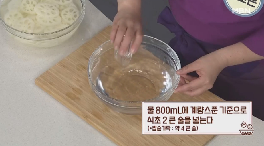 2. 물 800mL에 식초 4큰술을 섞은 뒤 썬 연근을 헹구고 체에 밭쳐 주세요.