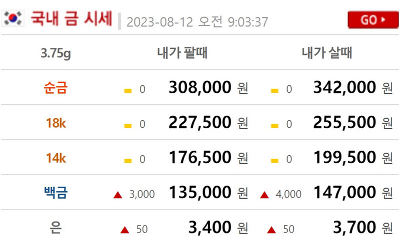 먼저 8월 12일을 기준으로 금시세 금값 한돈가격은 순금 1돈(Gold24k-3.75)을 팔때 308,000원, 살때 342,000원에 거래 가능합니다.